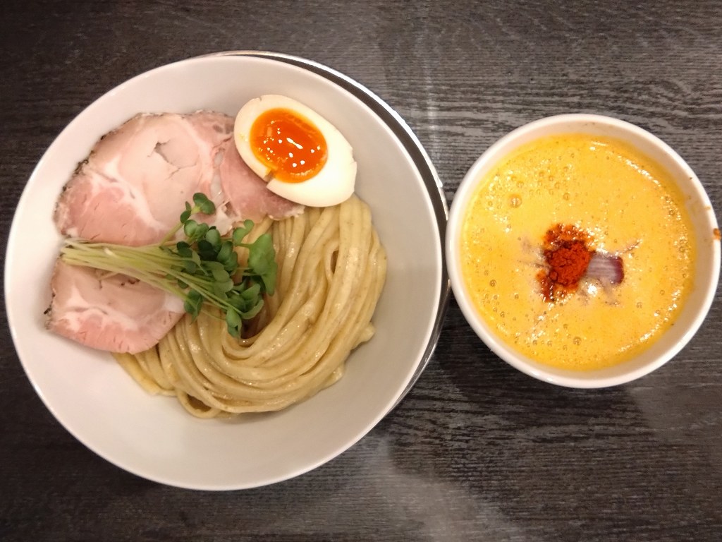 海老つけそばは、鶏白湯にアメリケーヌソースを加えたつけダレ、麺は太麺です。
